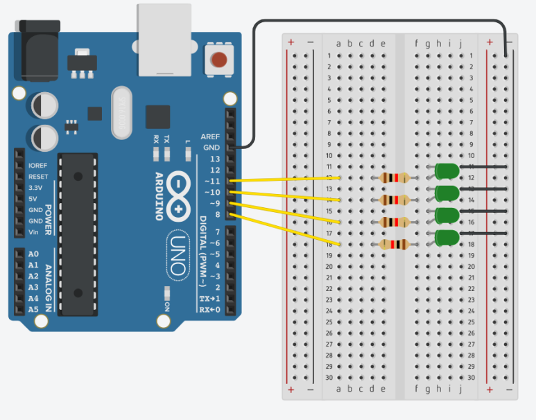 c. 저항의 남은 한쪽은 아두이노의 디지털 핀에 연결해 주세요. (이렇게 8,9,10,11번에 각각 연결해 주세요.)