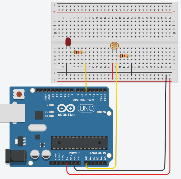 void setup() { pinMode(A0, INPUT); pinMode(5, OUTPUT); } void loop() { int bright = map(analogRead(A0),0,1023,0,255); analogWrite(5,bright); delay(100); }Q. 감지되는 빛의 양이 일정 수준이상 넘어가면 자동으로 꺼지는 기능