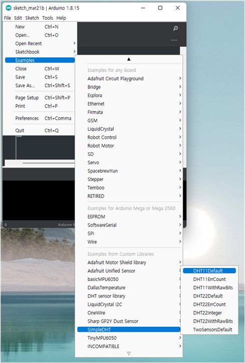 메뉴창의 'file'-> Examples에 가면 여러분이 추가한 'SimpleDHT'에 대한 예제가 있어요.